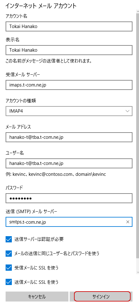 | 受信メールサーバー | imaps.t-com.ne.jp ※SSLを使わない場合【imap.t-com.ne.jp】 |