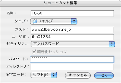 | ホスト | www2.***.t-com.ne.jp 「ホームページエリアレンタルサービス 登録完了のお知らせ」に記載されている転送先サーバホスト名を半角英数字で入力します。 「*」はお客様毎に異なりますので、ご注意ください。 |