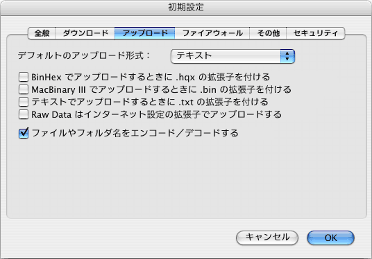 【デフォルトのアップロード形式】のプルダウンメニューから【テキスト】を選択します。チェックは【ファイルやフォルダ名をエンコード/デコードする】のみにチェックします。