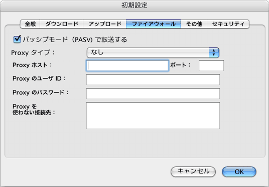 【パッシブモード(PASV)で転送する】にチェックします。設定が終ったら【OK】ボタンをクリックして【初期設定】ウィンドウを閉じます。